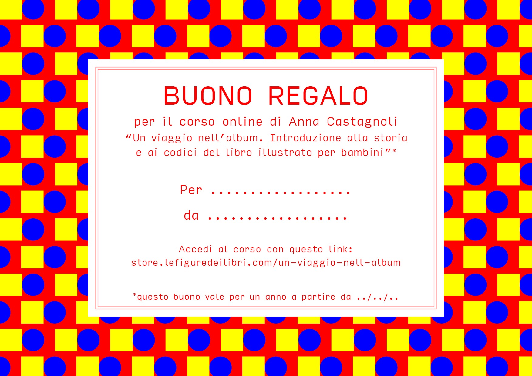 Dopo l’acquisto, ti verrà inviato via mail il Buono Regalo, disegnato da Anna Martinucci, in formato PDF.